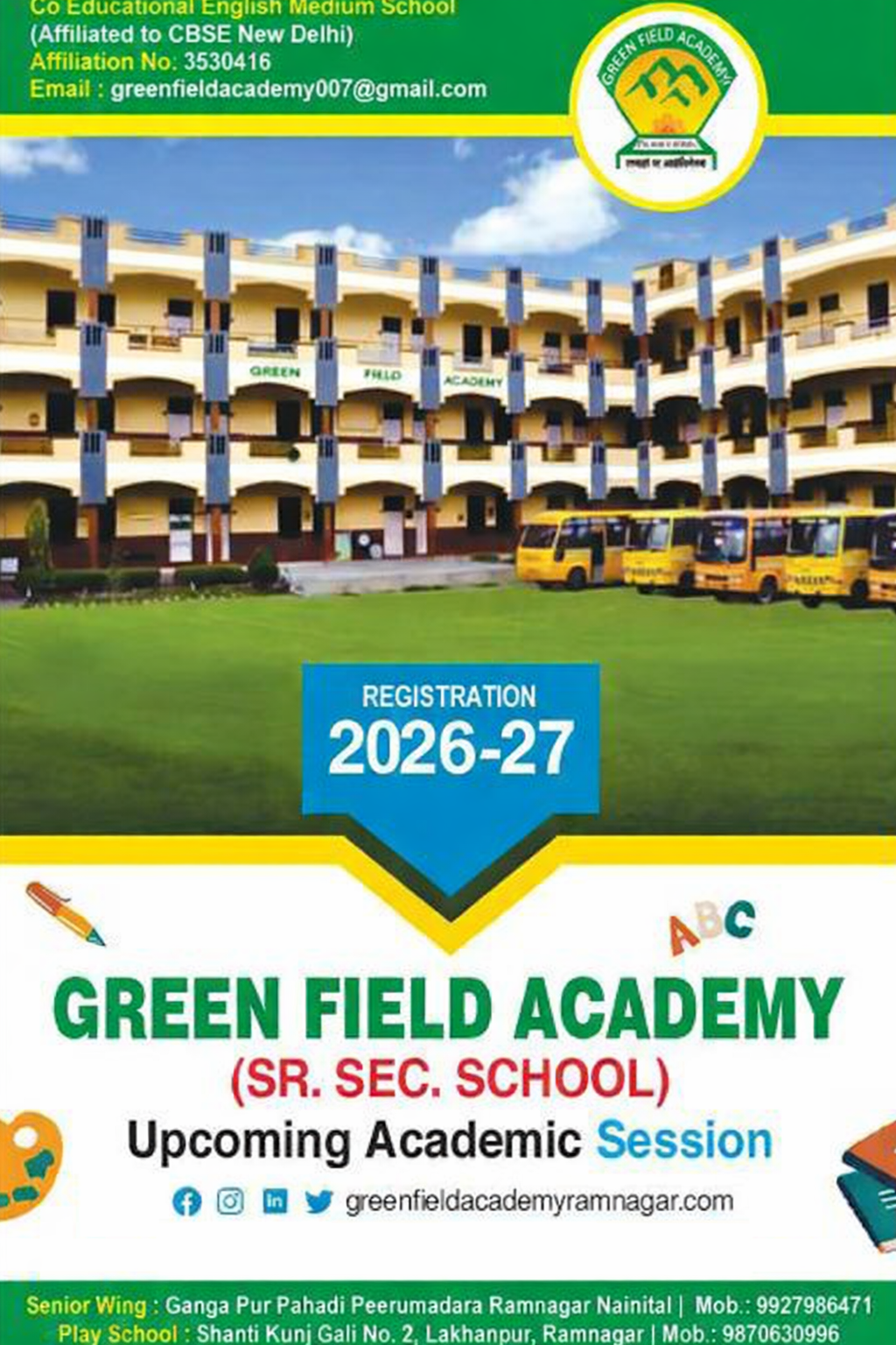Welcome To Green Field Academy About Us Green Field Academy is a co-educational English Medium School, established in 2007 by Mr. S.S.H. It imparts education to children under the All India C.B.S.E. Scheme It has a separate Nursery and Prep block.